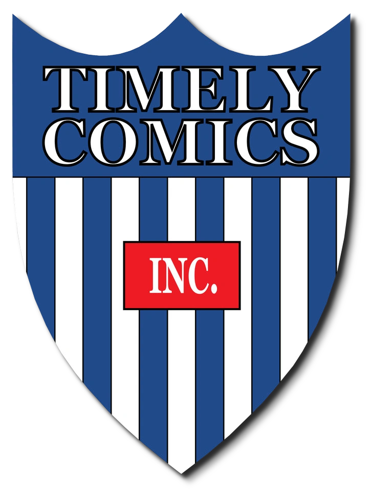 The Timely Comics logo used a shield shape, which gave it a strong and official look. The blue and white vertical stripes added structure, while the red “INC.” block in the center drew attention. At the top, the company name appeared in thin serif lettering, creating contrast against the bold shield design.