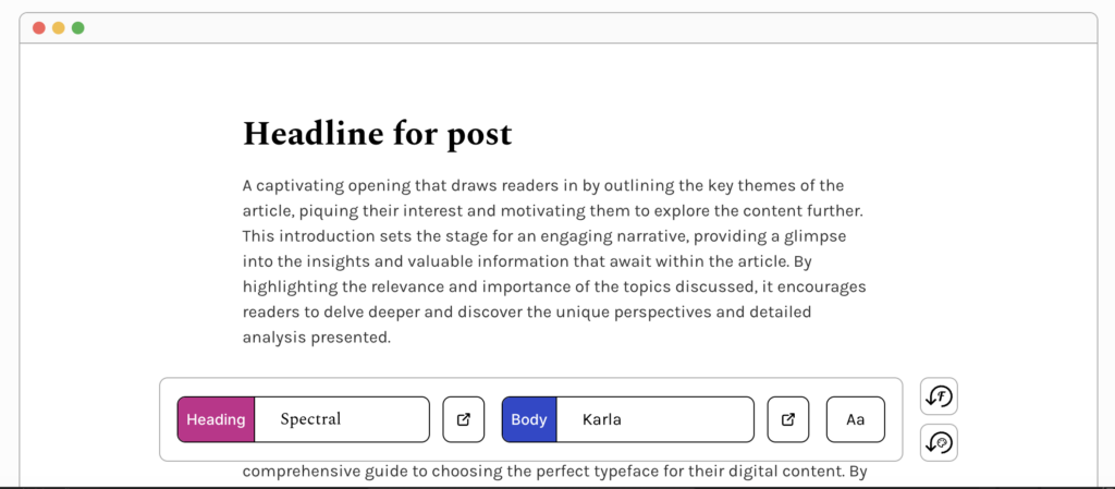 Start by selecting your body font. Then explore suggested pairings for headings. Test real paragraph content before finalizing.