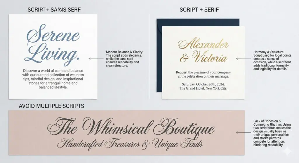 Applying script fonts selectively preserves typographic hierarchy and prevents visual fatigue.