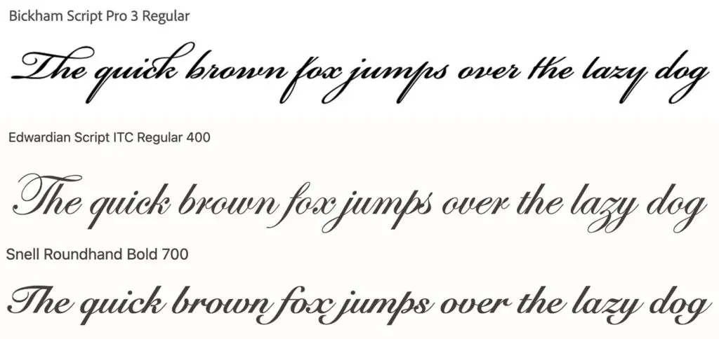Examples include Bickham Script, Edwardian Script, and Snell Roundhand.
